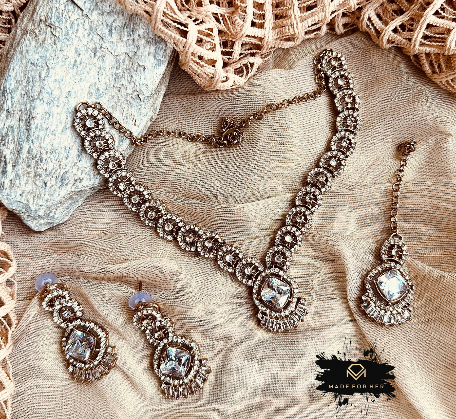 A true symbol of grace and tradition — the Tabeer Necklace Set blends classic charm with modern elegance. Handcrafted with precision, this set features a statement necklace paired with matching earrings, designed to enhance your look for any festive or formal occasion.